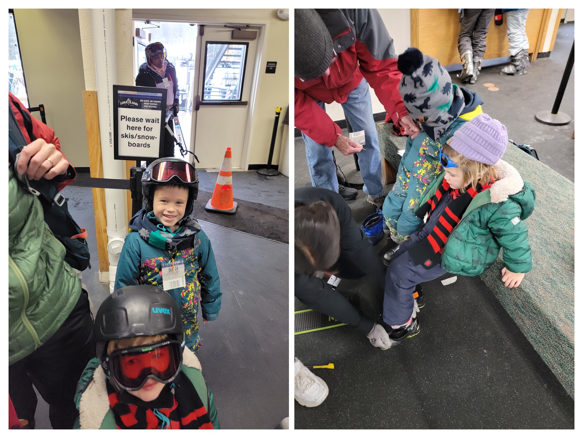 Getting the kids through the lift pass (free for kids 5 and under) line and fitted for rentals was a breeze. Loveland is really well set up for beginner kids, with folks helping size boots, helmets, and goggles, sweetly telling our kids how great they are doing.